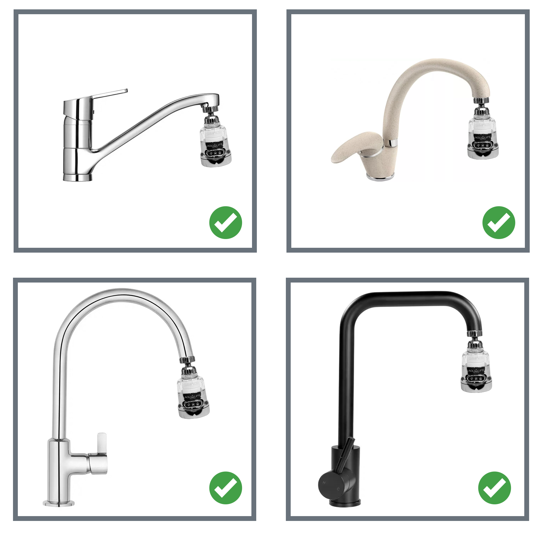 Extensia de robinet AQUALIFE™ Eco Spray este compatibilă cu toate tipurile de baterii prevăzute cu aerator rotund, atât cu filet interior cât și cu filet exterior. Produsul vine în pachet însoțit de un filtru de rezervă și 5 tipuri diferite de adaptoare, pentru a se putea potrivi cu marea majoritate a bateriilor existente în prezent pe piață.